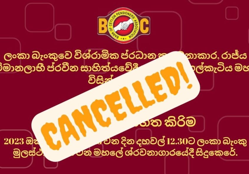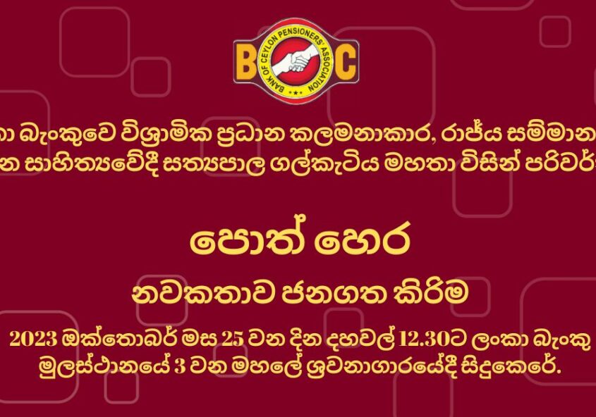2023-10- 25 දින ලංකා බැංකු ශ්රවනාගාරයේදී පැවත්වීමට නියමිතව තිබූ ලංකා බැංකුවේ විශ්රාමිකයින්ගේ සංගමයේ මහනුවර දිස්ත්රික් සාමාජික සත්යපාල ගල්කැටිය මහතා ගේ “පොත් හෙර”පරිවර්තිත කෘතිය දොරට වැඩීමේ උළෙල නොවලැක්වියහැකි හේතුවක් නිසාවෙන් එදින නොපැවත්වන බව…