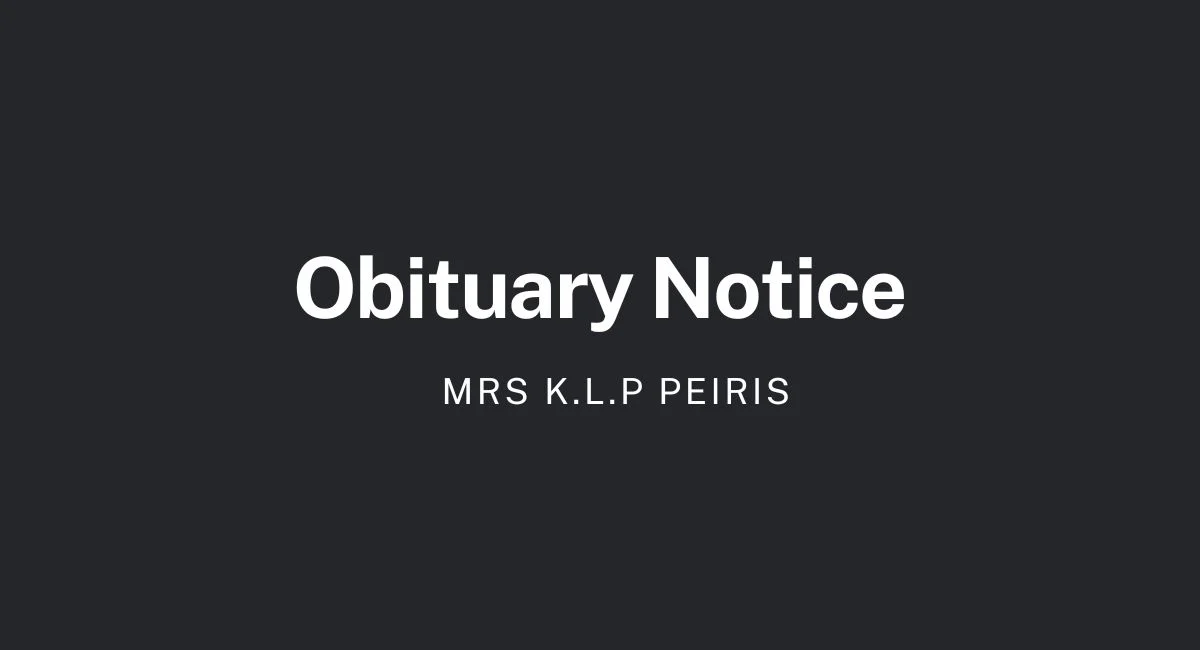 Mrs K.L.P.Peiris (LeelaLatha)(Executive Officer retired in 2014) of 303 Egoda uyana, Modara, Moratuwa expired. Last Respects may be paid at address till 2.30 pm on Thursday 29th. Cortege leaves at 2.30 pm for the Service at Holy Emmanuel Church Rawatawatte, Moratuwa , Burial at 4 pm.